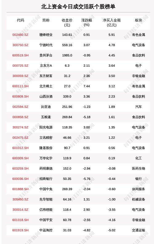 7月8日,北上资金成交活跃个股榜单中,净买入个股共13只,金额最多的是赣锋锂业(002460.SZ,收盘价:143.61元),净买入5.911亿元;净卖出个股共7只,金额最多的是中远海控(601919.SH,收盘价:31.03元),净卖出5.016亿元。