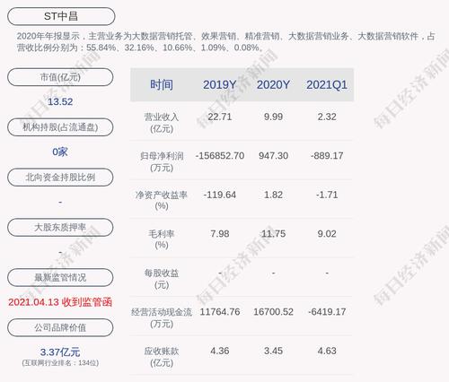 2020年年报显示,ST中昌的主营业务为大数据营销托管、效果营销、精准营销、大数据营销业务、大数据营销软件,占营收比例分别为:55.84%、32.16%、10.66%、1.09%、0.08%。
