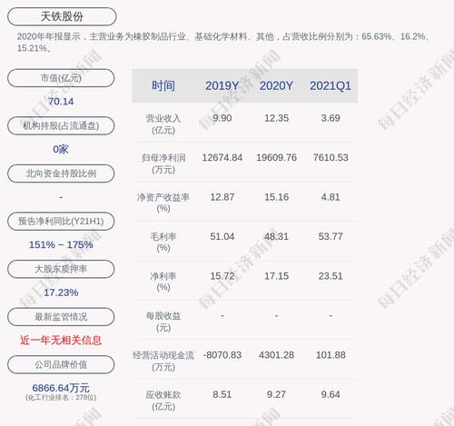 2020年年报显示,天铁股份的主营业务为橡胶制品行业、基础化学材料、其他,占营收比例分别为:65.63%、16.2%、15.21%。