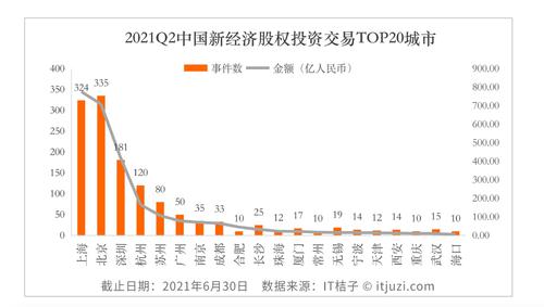 从城市来看,Q2国内新经济投资活跃TOP20城市中,北京位居榜首,是国内投融资交易最活跃的地区,投融资交易数量达335起,而上海是投融资金额最高的城市,交易达到775.9亿元。深圳、杭州与北京、上海位列第一梯队,交易事件数均超100起。