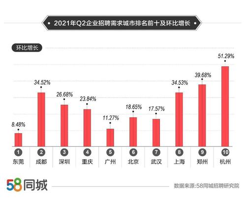 可见,新一线城市的招聘需求在二季度开始集中释放,尤其是制造业、批发和零售业高度发达的东莞、成都、杭州等地,为了在年中加码业务布局,企业增加招聘需求,使得二季度部分新一线城市的招聘需求及环比增速超过了一线城市。