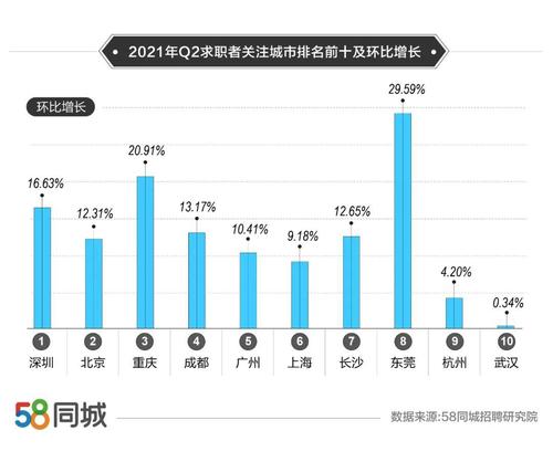 同期,深圳、北京和重庆位居求职热门城市前三甲位置,成都、广州、上海、长沙、东莞、杭州、武汉次之。新一线城市东莞求职热度最为积极,环比上升将近30%,重庆对求职者吸引力提升也较大,环比增速超过20%,排名上升2个位次。