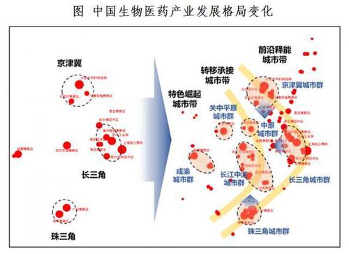 原来的“三足鼎立”格局正逐步演变为京津冀城市群、长三角城市群、珠三角城市群、长江中游城市群、中原城市群、成渝城市群和关中平原城市群七个引领生物医药产业发展的城市群。