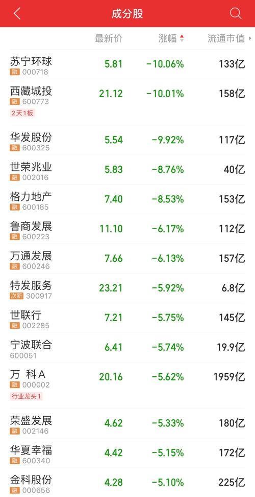 持续下跌的还有房地产板块,全板块共有104只股票下跌。