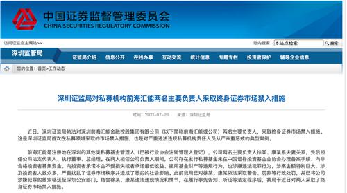 近日,深圳证监局公布的一起私募违规处理决定显示,依法对深圳前海汇能金融控股集团有限公司(以下简称前海汇能或公司)两名主要负责人采取终身证券市场禁入措施。