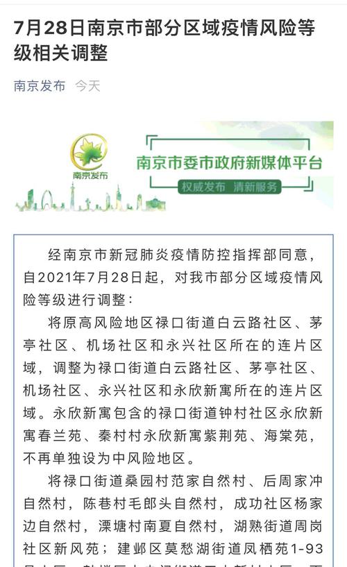 “南京发布”公众号28日信息显示,经南京市新冠肺炎疫情防控指挥部同意,自2021年7月28日起,对南京市部分区域疫情风险等级进行调整: