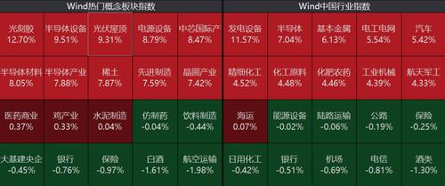 盘面上看,光刻胶概念爆发,多只股票涨停;储能概念、稀土、锂电池、BIPV概念等均强势拉升;半导体、软件、芯片、有色、化工、钢铁、汽车、教育、军工、医药等板块均走强;酿酒板块走势疲弱,银行、保险、旅游等板块小幅走低。