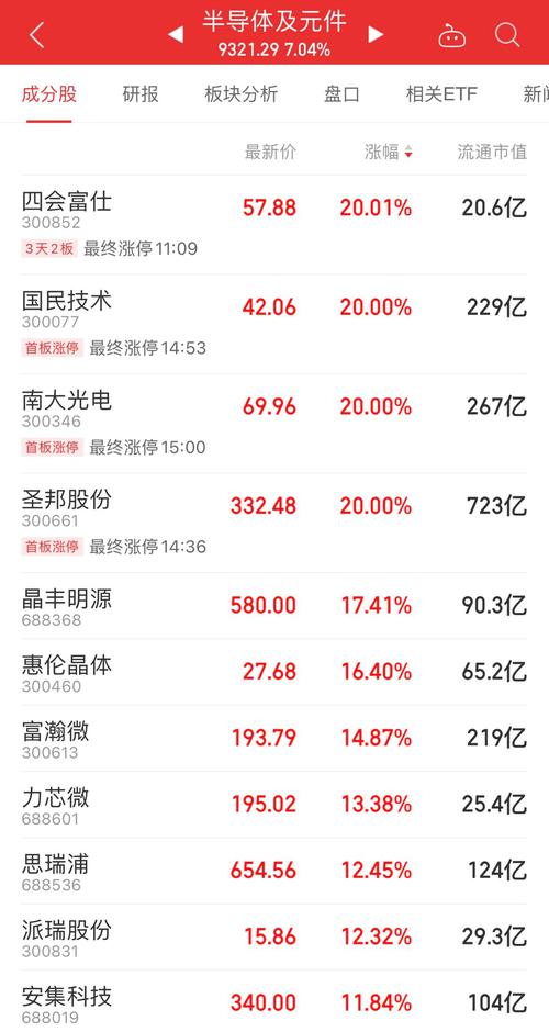 今天,科技股全线反弹,半导体全天冲高,四会富仕、国民技术等大涨20%封板,闻泰科技、江化微、康强电子等涨停。