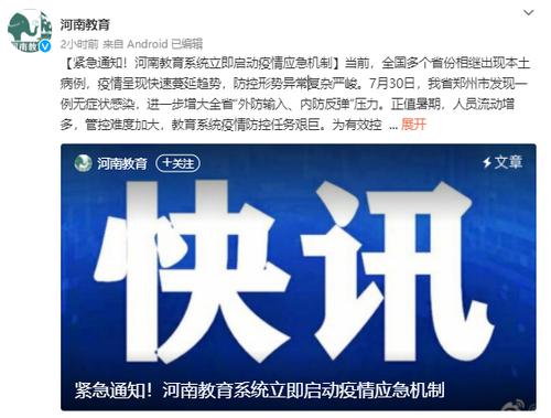 据河南省教育厅官方微博7月31日晚消息,当前,全国多个省份相继出现本土病例,疫情呈现快速蔓延趋势,防控形势异常复杂严峻。7月30日,我省郑州市发现一例无症状感染,进一步增大全省“外防输入、内防反弹”压力。正值暑期,人员流动增多,管控难度加大,教育系统疫情防控任务艰巨。为有效控制和降低教育系统疫情输入传播风险,认真做好当前全省教育系统疫情防控相关工作,现提醒抓好以下相关工作落实。
