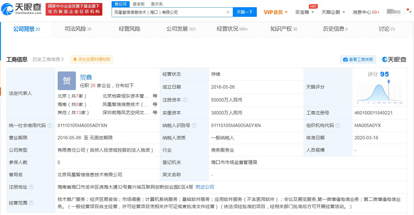 天眼查APP显示,凤凰智信信息技术(海口)有限公司成立于2016年6月,法人代表为贺鑫,注册资本5亿元,经营范围包括技术推广服务;经济贸易咨询;市场调查;计算机系统服务;基础软件服务;应用软件服务(不含医用软件);会议及展览服务,第一类增值电信业务等。
