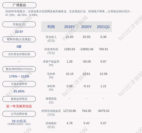 2020年年报显示,广博股份的主营业务为互联网及相关服务业、文具用品行业、跨境电子商务,占营收比例分别为:47.15%、46.76%、6.09%。