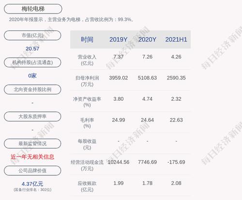 每经AI快讯,梅轮电梯(SH 603321,收盘价:6.7元)8月20日晚间发布半年度业绩报告称,2021年上半年营业收入约4.26亿元,同比增加36.47%;归属于上市公司股东的净利润盈利约2590万元,同比增加1.38%;基本每股收益盈利0.08元。