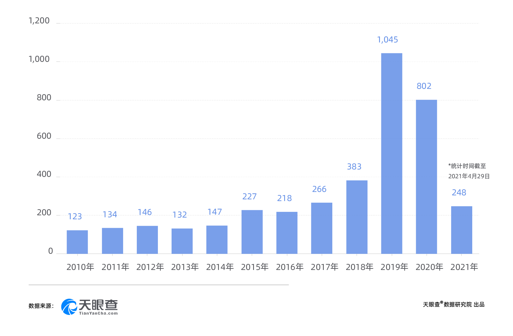 天眼查大数据显示,目前中国有超3000家状态为在业、存续、迁入、迁出的汉服相关企业,其中73%为个体商户,23%为有限责任公司。2019年汉服注册企业数量倍增,达1045家,2020年为802家,2021年前四个月新注册超240家企业,平均每天新注册2家。