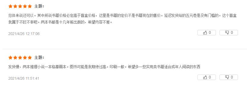有“欧气”读者抽到隐藏款:“等了好久终于收到了,我收到的书都有塑封,不错不错,书的豆瓣评分都在七八分左右。”“抽到了隐藏款,开心,是一套推理小说。”;也有人感到书籍不尽人意:“选书有点失望都是旧书的感觉,一本《饵室》,一本《红色棺材之谜》,有点脏,也能接受,送的文创本子很好看,书袋也不错,买两个盲盒都是一样的文字,不同的颜色,这个有点可惜了。”“发货慢,两本推理小说一本临摹画本。图书可能是我期待过高,印刷一般。”