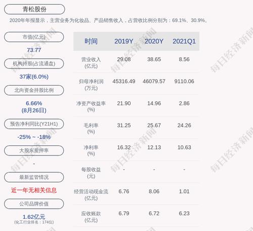 2020年年报显示,青松股份的主营业务为化妆品、产品销售收入,占营收比例分别为:69.1%、30.9%。