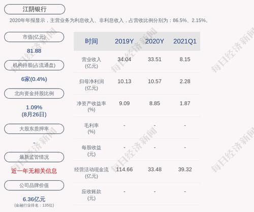 2020年年报显示,江阴银行的主营业务为利息收入、非利息收入,占营收比例分别为:86.5%、2.15%。