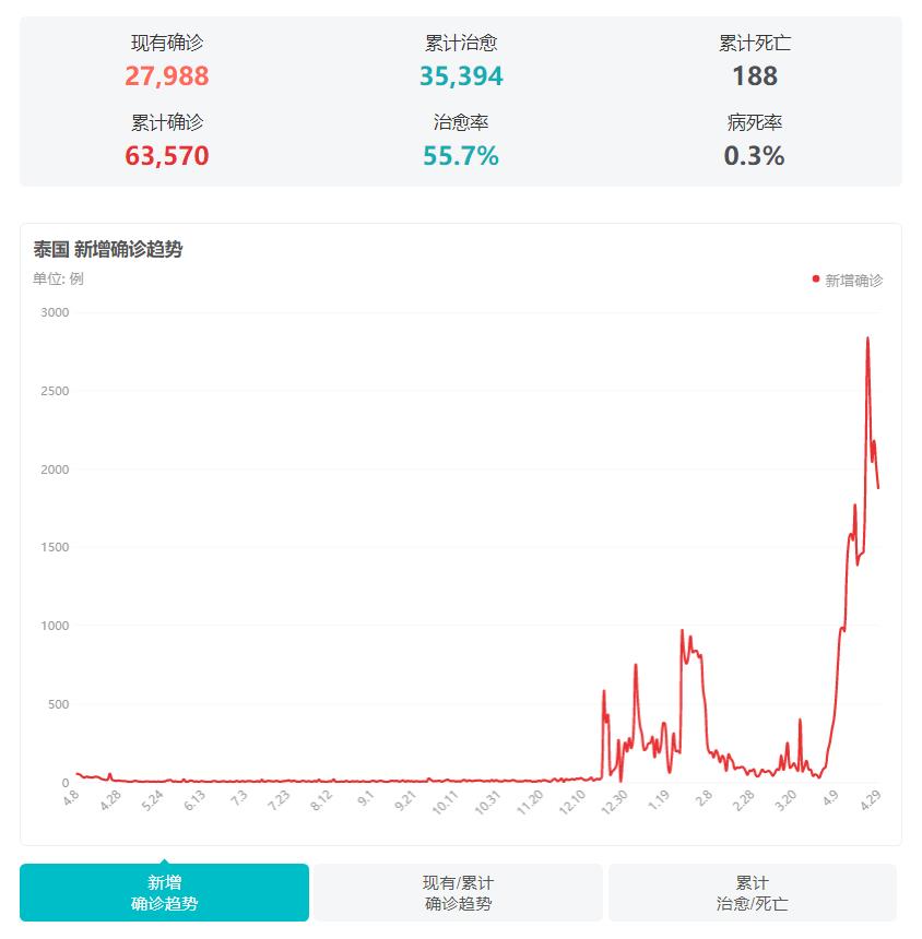 4月29日,泰国单日新增确诊病例降至2000人以下,为1871例,累计确诊63570例;新增死亡病例10例,累计死亡188例,其中4月份的死亡病例数(94例)占死亡病例总数的一半。