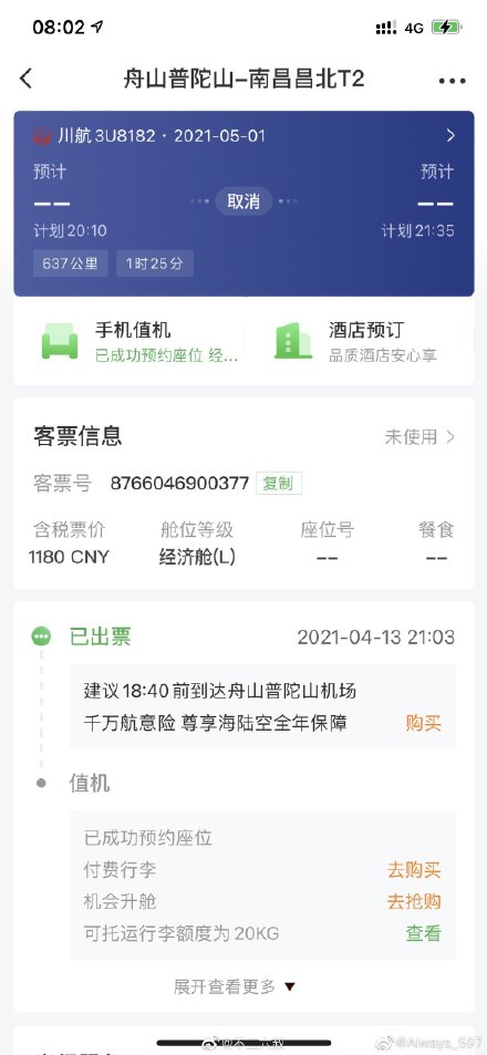 还有一位网友吐槽川航,“五一”回老家的计划泡汤,川航称取消航班只是因为系统误发消息,该网友再次退票遭遇无法全款退票的问题。