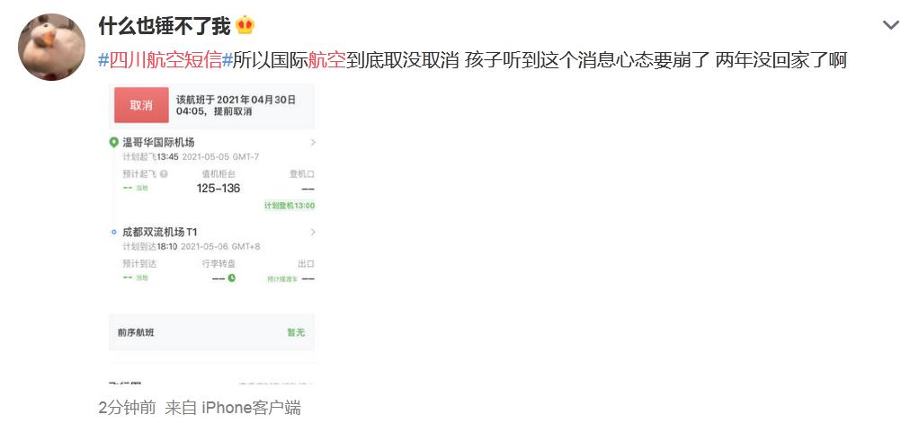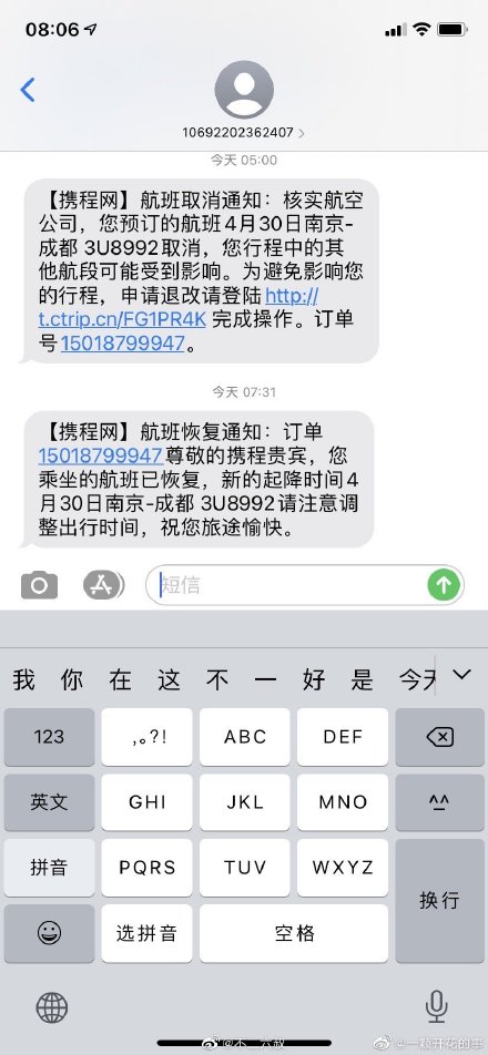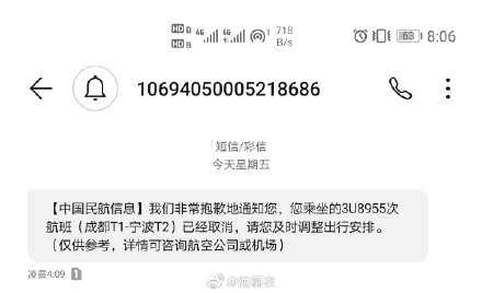你收到川航的取消航班短信了吗?(中新经纬APP)