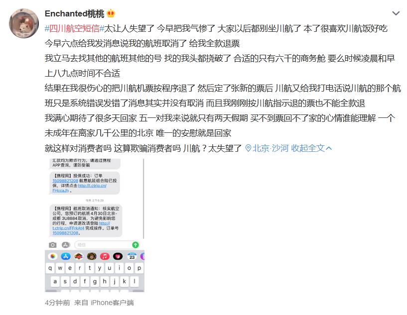 这位网友说道,“太让人失望了。今早六点给我发消息说我的航班取消了,给我全款退票。我立马去找其他的航班其他的号,合适的只有六千的商务舱,要么时候凌晨和早上八九点时间不合适,结果把川航机票按程序退了。定了张新的票后,川航说那个航班只是系统错误发错了消息其实并没有取消,而且退的票也不能全款退。我满心期待了很多天回家,买不到票回不了家的心情谁能理解。”